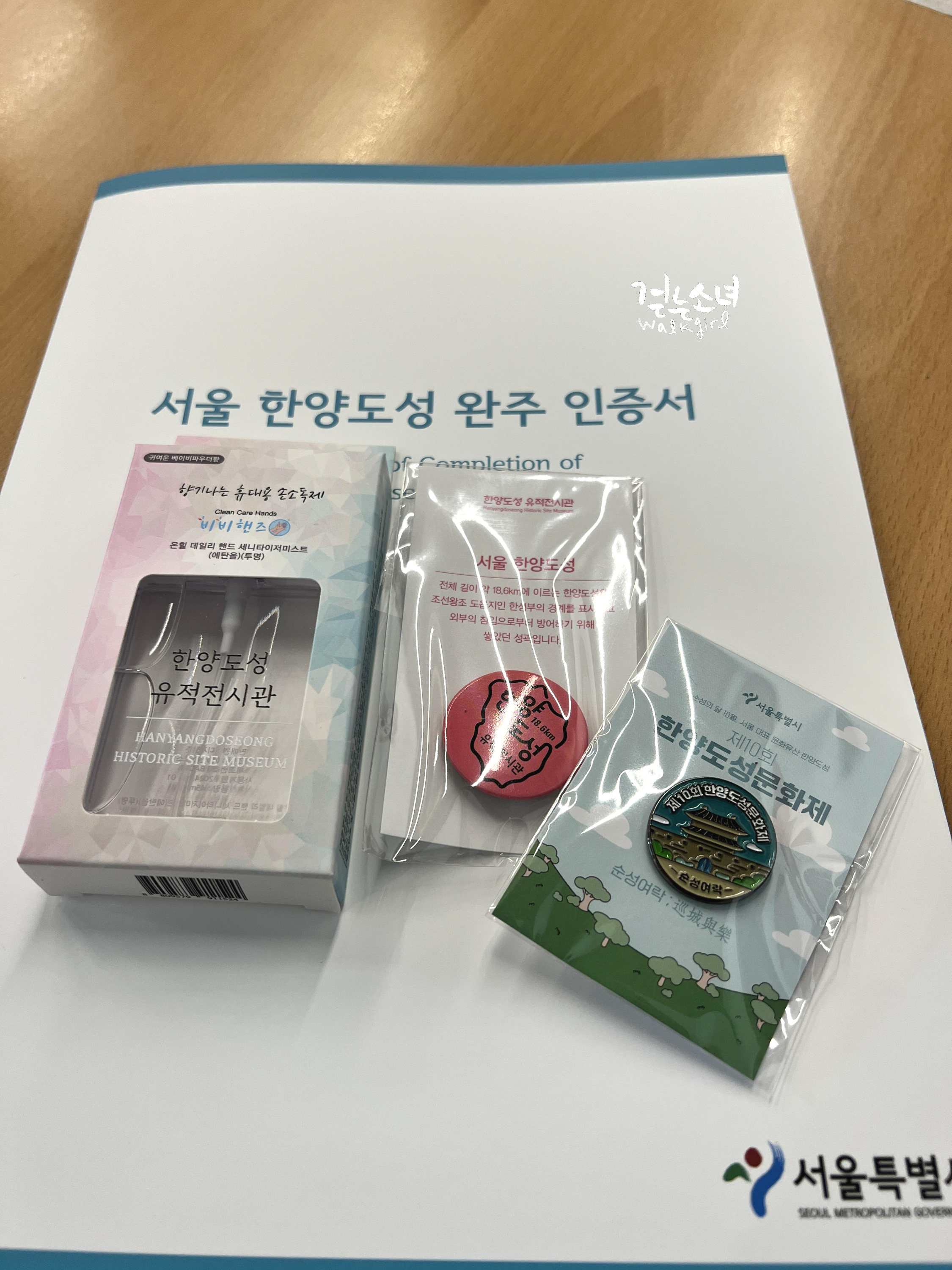 가을 완주 뱃지와 인증서, 한양도성문화제 뱃지, 그리고 손 세정제까지 삼종을 받아서 집으로 돌아왔다.